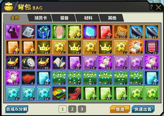 Ø 背包分为全部、球员卡、装备、材料、其他等分类页签