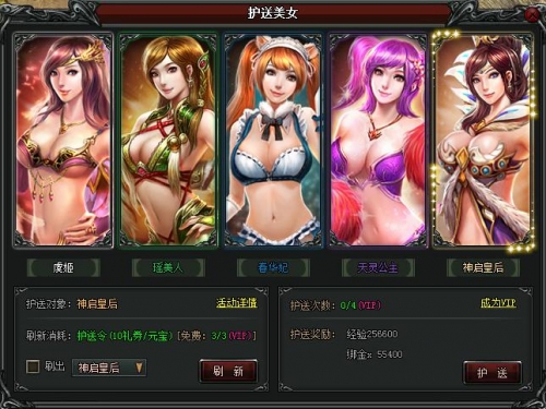 4、护送美女有白、绿、蓝、紫、橙5种品质,默认为白色品质,可以消耗护送令、礼券或元宝刷新美女品质,护送美女品质越高,奖励约丰富。